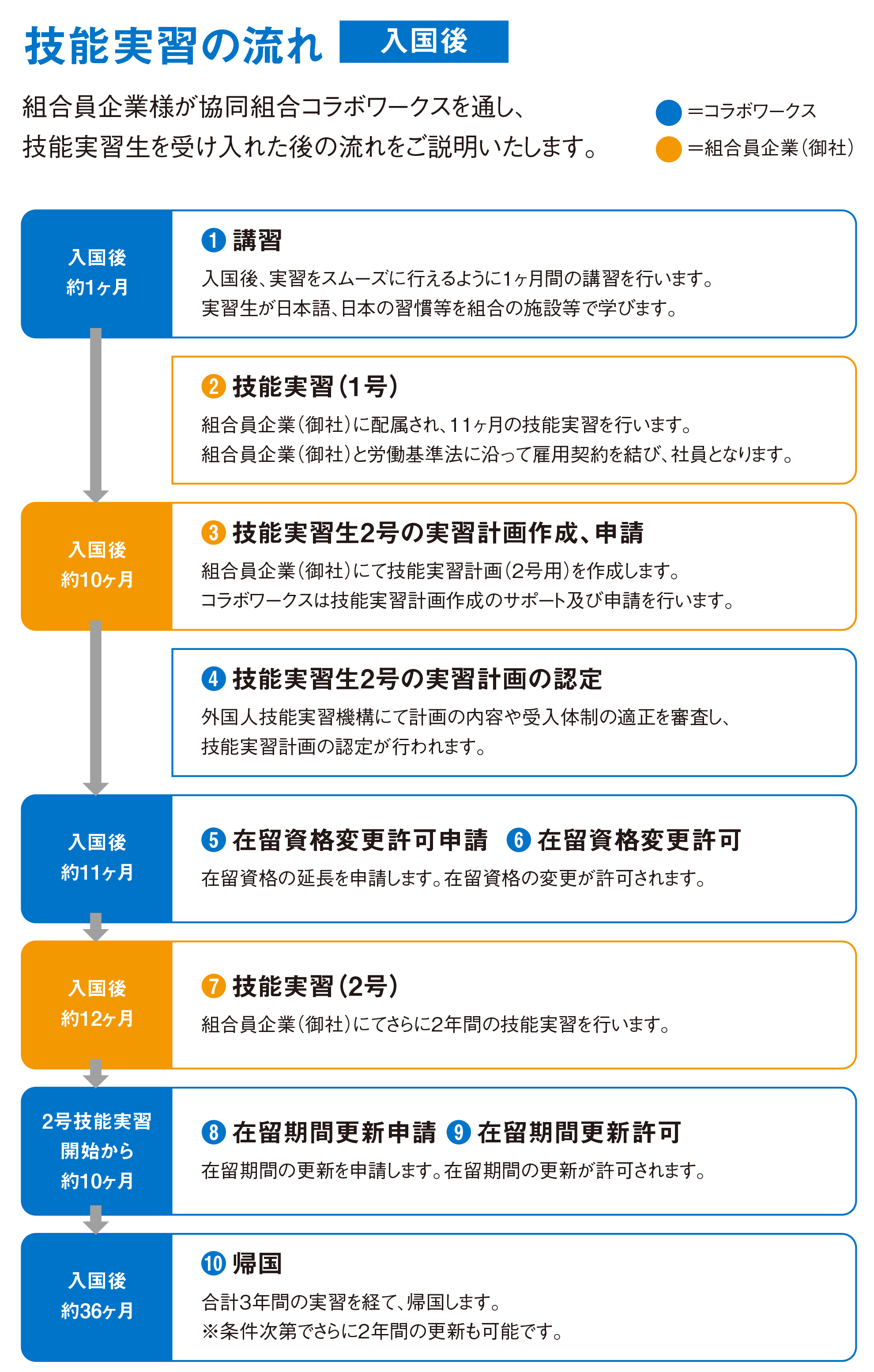 組合員企業様が協同組合コラボワークスを通し、技能実習生を受け入れた際の流れをご説明いたします。